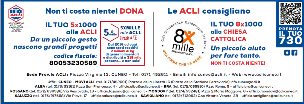Coloro che nel 2025 hanno effettuato questa scelta, per quanto riguarda le ACLI di Cuneo, hanno contribuito a mandare avanti il progetto “Welfare Informa”, una piattaforma digitale accessibile via web, che è un grande “catalogo” sempre aggiornato, grazie al quale ciascun utente può trovare, con l’aiuto di un operatore opportunamente formato, in tempo reale, le misure economiche e i contributi (sostegni al reddito, integrazioni, assegni sociali, maggiorazioni ecc.) a cui ha diritto, a seconda della condizione in cui si trova.