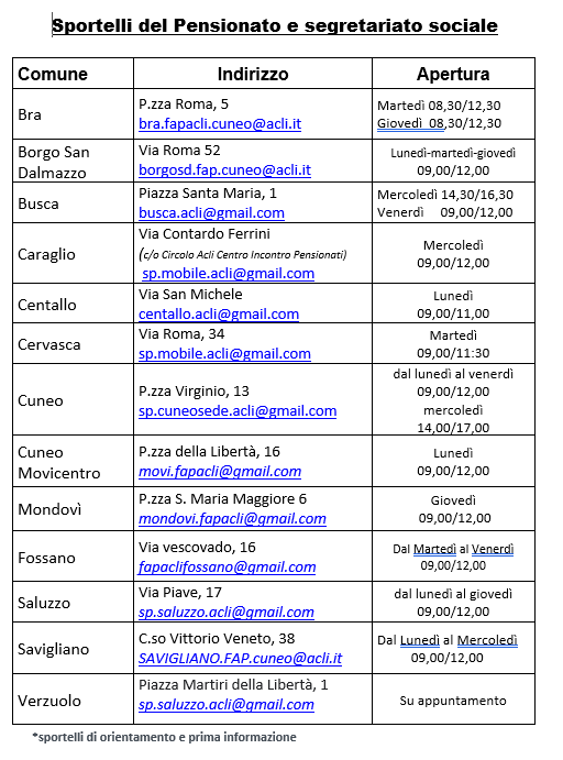 Di seguito gli Sportelli Sociali e del Pensionato sostenuti dalla Federazione Anziani Pensionati (FAP) dislocati sul territorio della provincia di Cuneo
